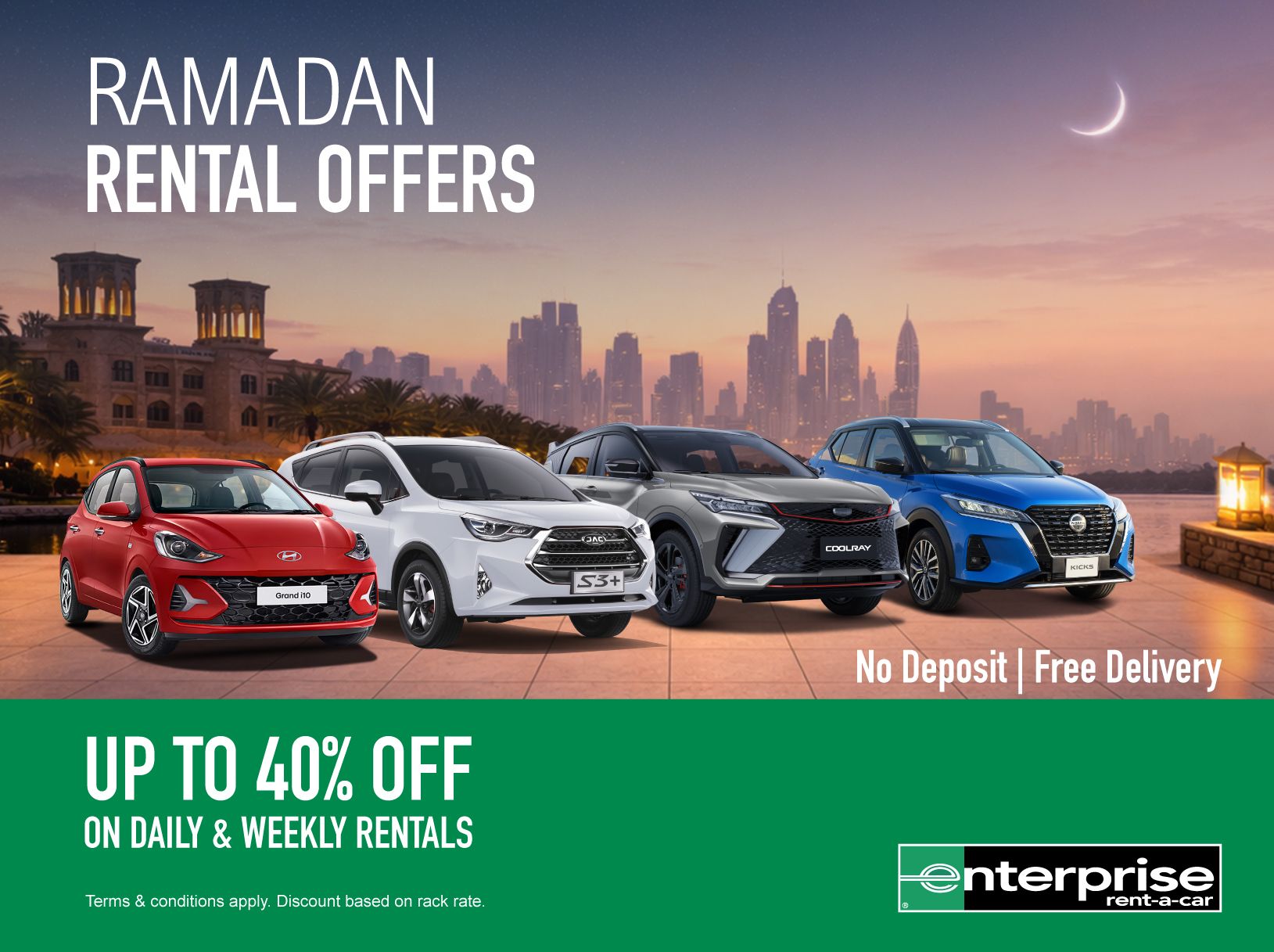 This Ramadan, enjoy incredible savings with up to 40% off on daily and weekly rentals. Choose from our young fleet of economy vehicles and SUVs including Hyundai i10, JAC JS3, Geely Coolray and Nissan Kicks. With our no deposit option, you can drive away without any hassle. But hurry, this limited-time offer is valid until stocks last!